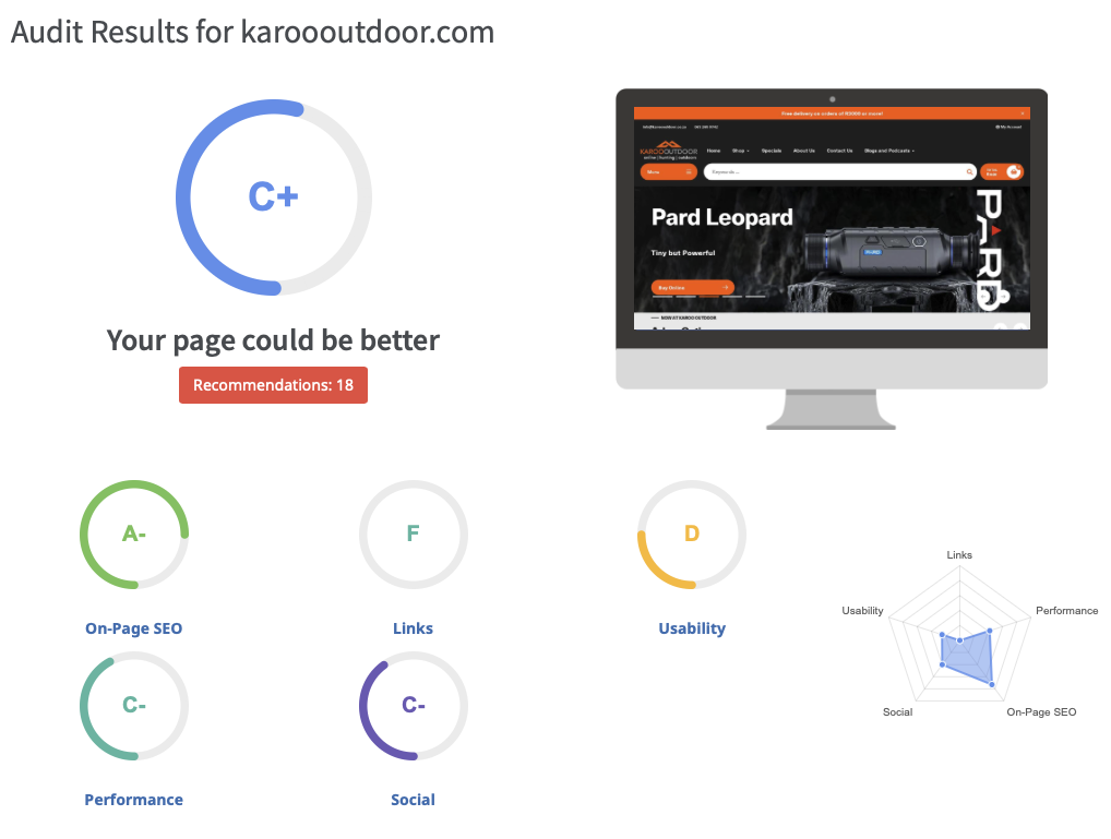 SEO Audit Report for Karoo Outdoor. Once payment is completed, you will gain access to download the report.